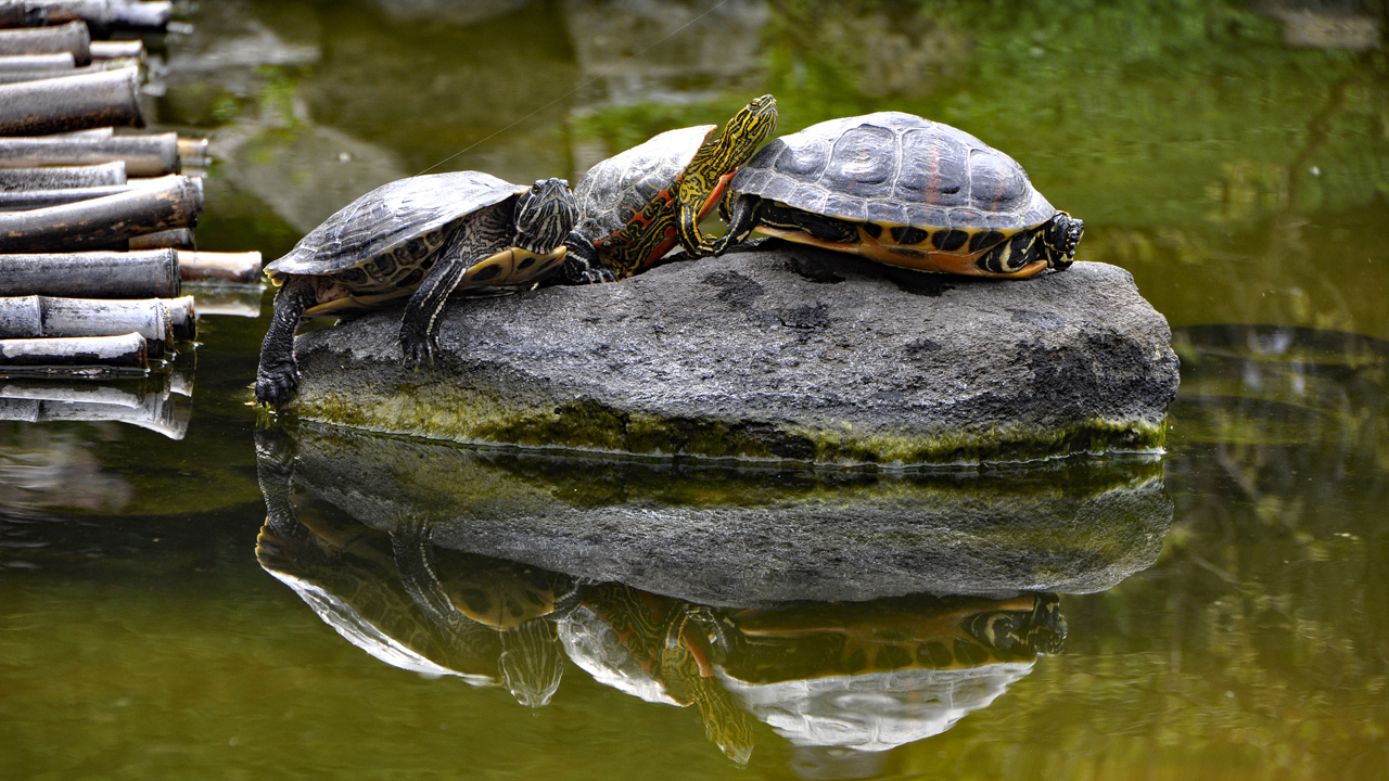 Three turtles has climbed onto a flat rock and seemed to be enjoying