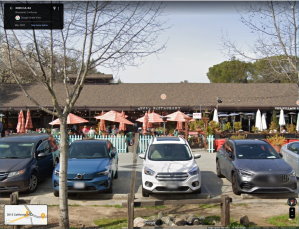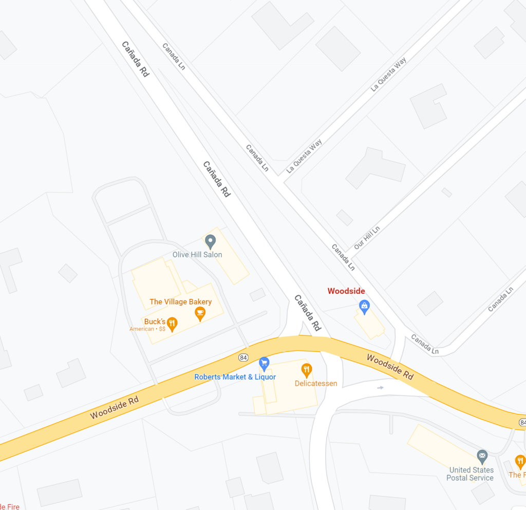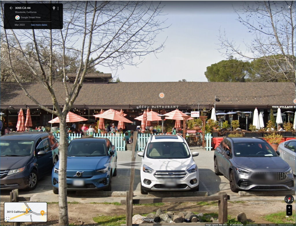 intersection with a right turn ramp Go right turn ramp and immediately on the right side is a bakery and Buck's Restaurant 3062 Woodside Rd Parking can be tight, but hopefully in the middle of the afternoon, it will be OK |